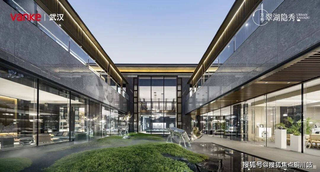 走入下沉式庭院,庭院中以画意布局造型花木与绿洲,透过高大的落地玻璃幕墙,室内的社区公共生活场景与室外园景融为一体,是翠湖隐秀全景生活、立体风景的真实表达。
